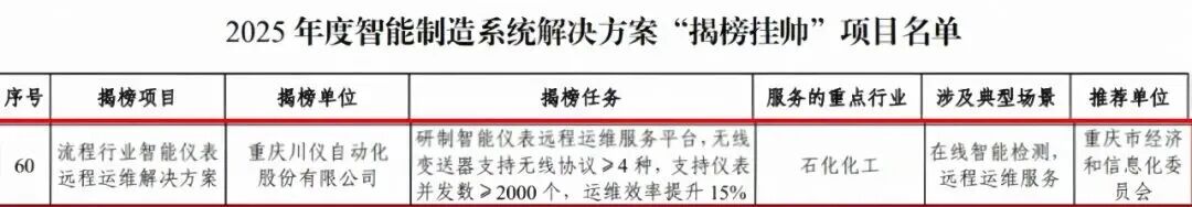 重庆川仪自动化股份有限公司(以下简称“川仪股份”)“流程行业智能仪表远程运维解决方案”成功上榜工信部2025年度智能制造系统解决方案“揭榜挂帅”项目名单。