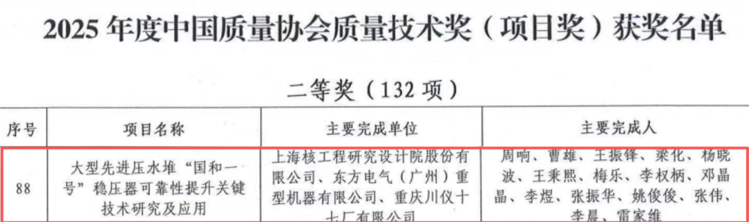 重庆川仪十七厂有限公司(以下简称“川仪十七厂”)与上海核工程研究设计院股份有限公司、东方电气(广州)重型机器有限公司联合攻关的“大型先进压水堆‘国和一号’稳压器可靠性提升关键技术研究及应用”项目,荣获2025年中国质量协会“质量技术奖”二等奖。